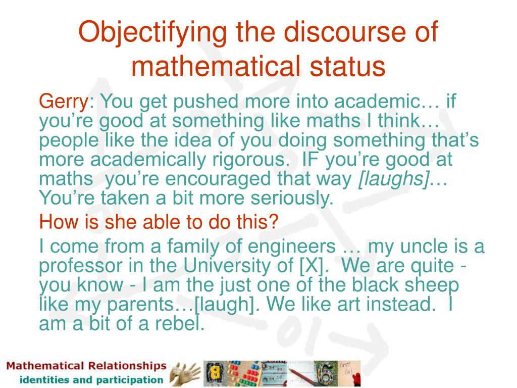 Objectifying the discourse of mathematical status Gerry: You get pushed more into academic… if you’re good at something like maths I think… people like the idea of you doing something that’s more academically rigorous. IF you’re good at maths you’re encouraged that way [laughs]… You’re taken a bit more seriously. How is she able to do this? I come from a family of engineers …my uncle is a professor in the University of [X]. We are quite - you know -I am the just one of the black sheep like my parents…[laugh]. We like art instead. I am a bit of a rebel.