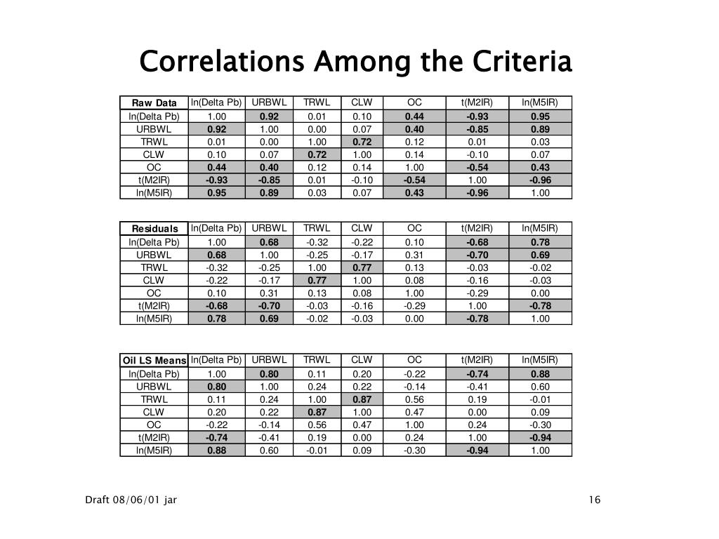 Transformations • Box-Cox procedure was applied using all matrix data. • Delta lead benefits from a natural logarithm transformation. • Method 2 IR at 300 hours is best raised to a power of -0.8 for analyses. • Method 5 IR at 300 hours likes a natural logarithm transformation. • No data transformations are indicated for other responses analyzed.