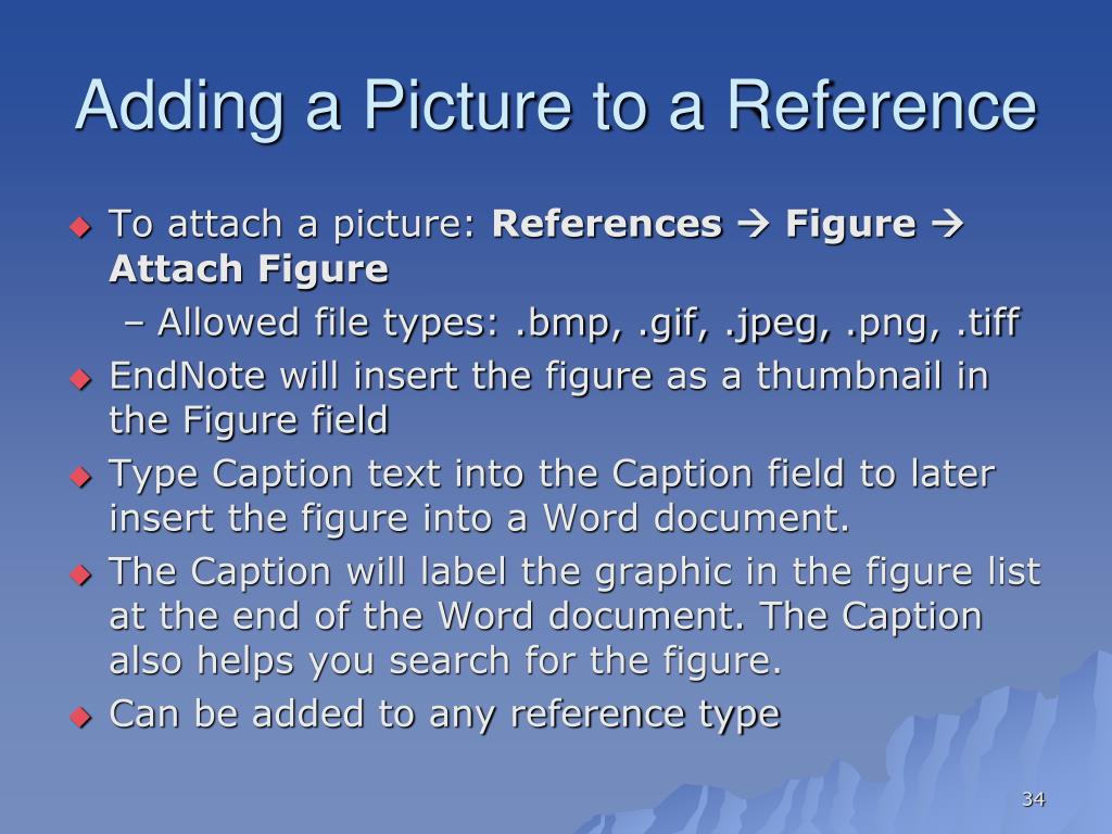 Adding a Picture to a Reference • To attach a picture: References Figure Attach Figure • Allowed file types: .bmp, .gif, .jpeg, .png, .tiff • EndNote will insert the figure as a thumbnail in the Figure field • Type Caption text into the Caption field to later insert the figure into a Word document. • The Caption will label the graphic in the figure list at the end of the Word document. The Caption also helps you search for the figure. • Can be added to any reference type