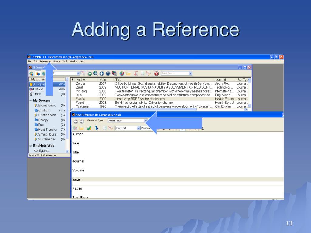 EndNote Demo (1 of 2) • Create a new EndNote library • Add a Reference • Manually • Direct export • Connection files • Import filters • Add Items to a Reference • Insert pictures • Insert objects • Insert links to PDF files