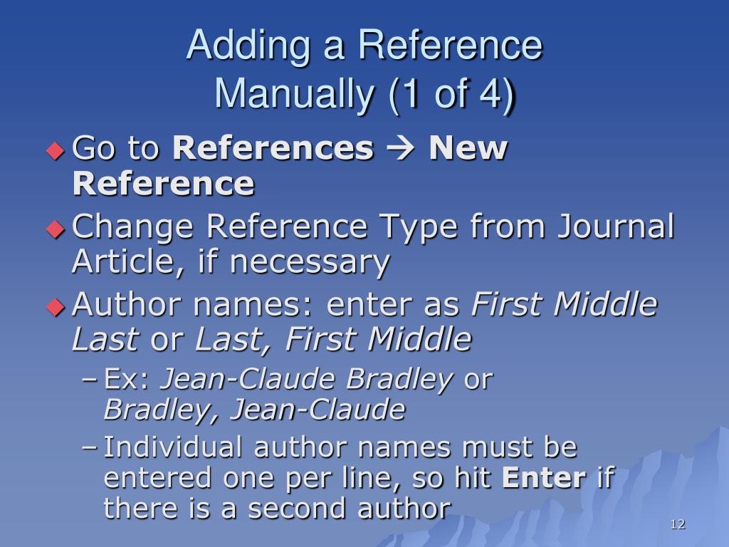 Adding a ReferenceManually (1 of 4) • Go to References New Reference • Change Reference Type from Journal Article, if necessary • Author names: enter as First Middle Last or Last, First Middle • Ex: Jean-Claude Bradley orBradley, Jean-Claude • Individual author names must be entered one per line, so hit Enter if there is a second author