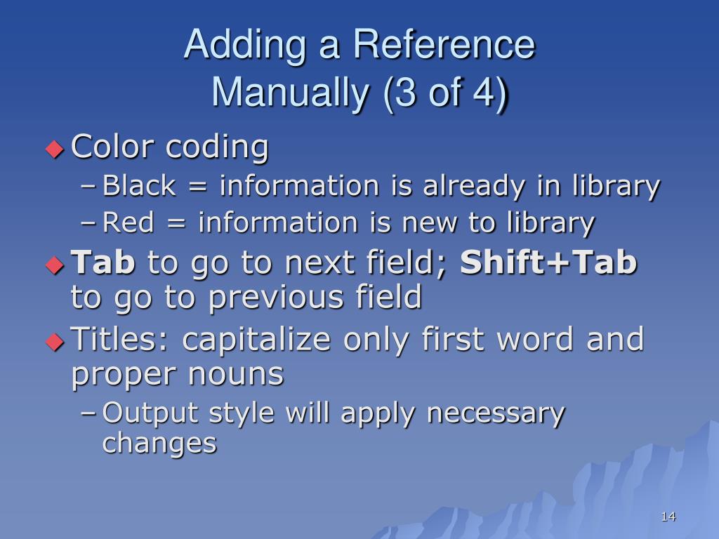 Adding a ReferenceManually (3 of 4) • Color coding • Black = information is already in library • Red = information is new to library • Tab to go to next field; Shift+Tab to go to previous field • Titles: capitalize only first word and proper nouns • Output style will apply necessary changes