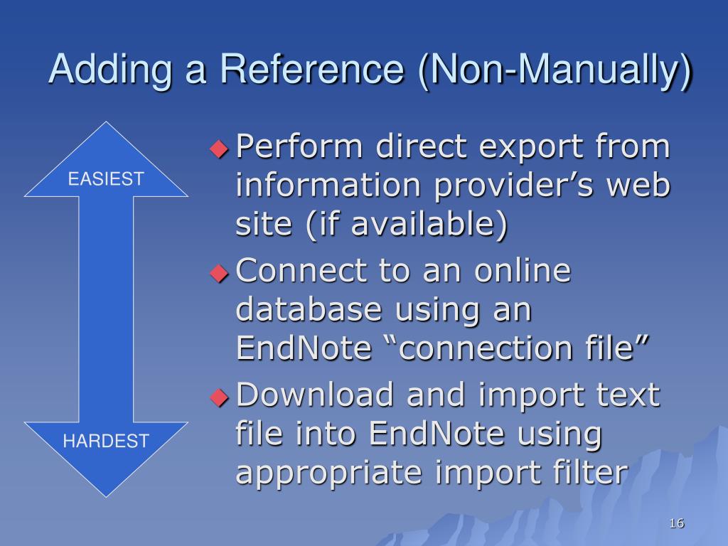 Adding a Reference (Non-Manually) EASIEST HARDEST • Perform direct export from information provider’s web site (if available) • Connect to an online database using an EndNote “connection file” • Download and import text file into EndNote using appropriate import filter