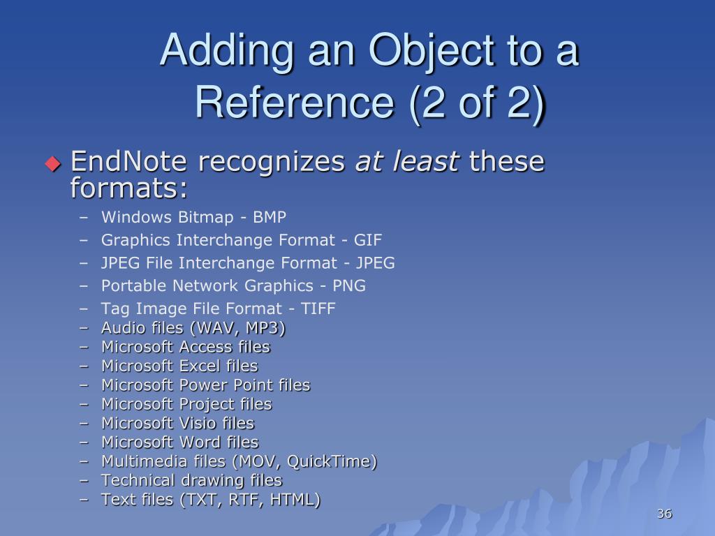 Adding an Object to aReference (2 of 2) • EndNote recognizes at least these formats: • Windows Bitmap - BMP • Graphics Interchange Format - GIF • JPEG File Interchange Format - JPEG • Portable Network Graphics - PNG • Tag Image File Format - TIFF • Audio files (WAV, MP3) • Microsoft Access files • Microsoft Excel files • Microsoft Power Point files • Microsoft Project files • Microsoft Visio files • Microsoft Word files • Multimedia files (MOV, QuickTime) • Technical drawing files • Text files (TXT, RTF, HTML)