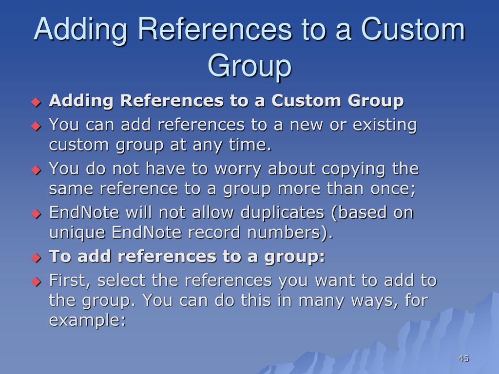 Adding References to a Custom Group Adding References to a Custom Group You can add references to a new or existing custom group at any time. You do not have to worry about copying the same reference to a group more than once; EndNote will not allow duplicates (based on unique EndNote record numbers). To add references to a group: First, select the references you want to add to the group. You can do this in many ways, for example: