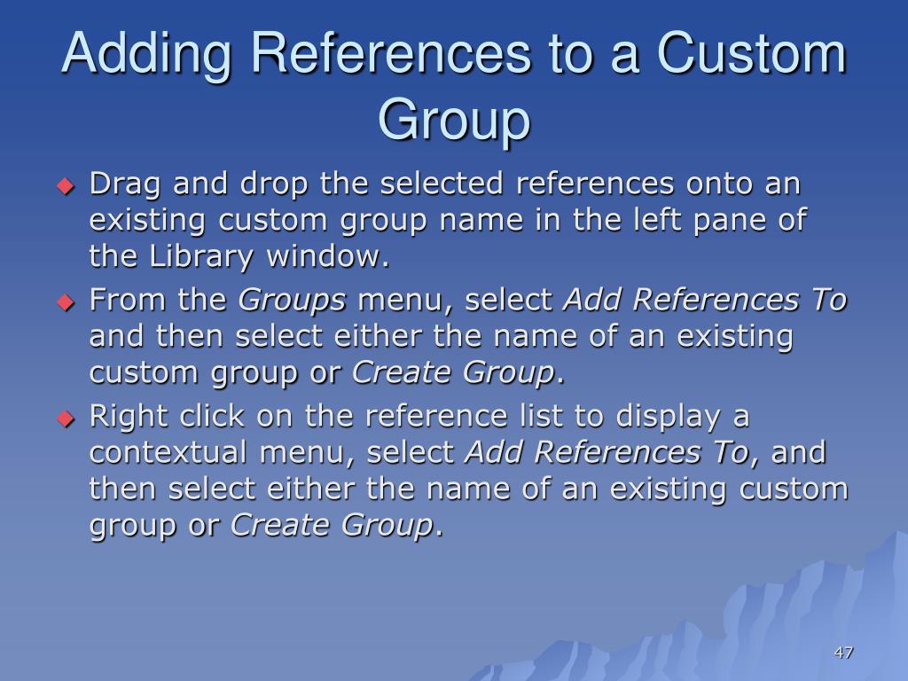 Adding References to a Custom Group Drag and drop the selected references onto an existing custom group name in the left pane of the Library window. From the Groups menu, select Add References To and then select either the name of an existing custom group or Create Group. Right click on the reference list to display a contextual menu, select Add References To, and then select either the name of an existing custom group or Create Group.