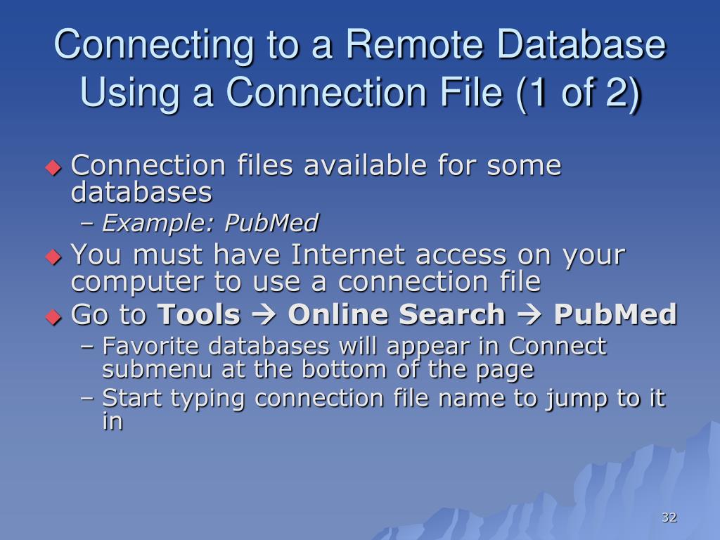 Connecting to a Remote DatabaseUsing a Connection File (1 of 2) • Connection files available for some databases • Example: PubMed • You must have Internet access on your computer to use a connection file • Go to Tools Online Search PubMed • Favorite databases will appear in Connect submenu at the bottom of the page • Start typing connection file name to jump to it in