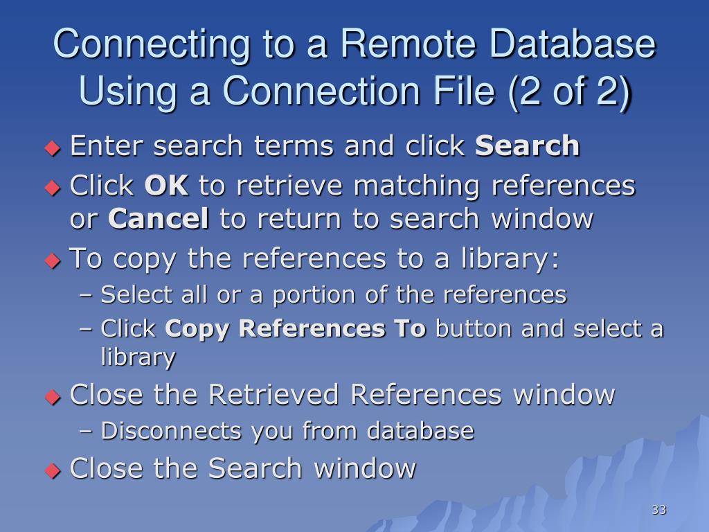 Connecting to a Remote DatabaseUsing a Connection File (2 of 2) • Enter search terms and click Search • Click OK to retrieve matching references or Cancel to return to search window • To copy the references to a library: • Select all or a portion of the references • Click Copy References To button and select a library • Close the Retrieved References window • Disconnects you from database • Close the Search window