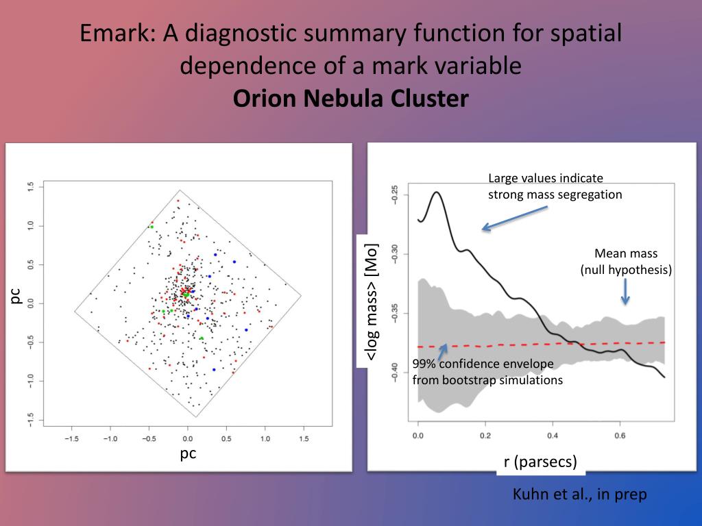 Emark: A diagnostic summary function for spatial dependence of a mark variable Orion Nebula Cluster Large values indicate strong mass segregation Mean mass (null hypothesis) pc <log mass> [Mo] 99% confidence envelope from bootstrap simulations pc r (parsecs) Kuhn et al., in prep