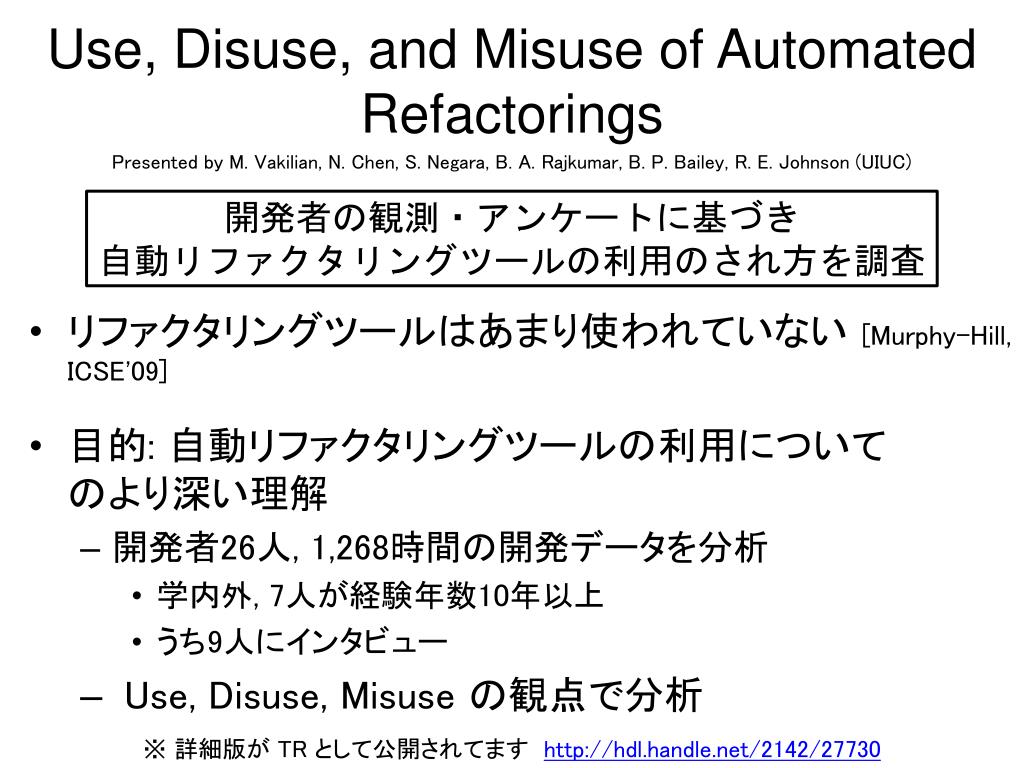 Use, Disuse, and Misuse of Automated Refactorings Presented by M. Vakilian, N. Chen, S. Negara, B. A. Rajkumar, B. P. Bailey, R. E. Johnson (UIUC) • リファクタリングツールはあまり使われていない [Murphy-Hill, ICSE'09] • 目的: 自動リファクタリングツールの利用についてのより深い理解 • 開発者26人, 1,268時間の開発データを分析 • 学内外, 7人が経験年数10年以上 • うち9人にインタビュー • Use, Disuse, Misuse の観点で分析 開発者の観測・アンケートに基づき自動リファクタリングツールの利用のされ方を調査 ※ 詳細版が TR として公開されてます http://hdl.handle.net/2142/27730