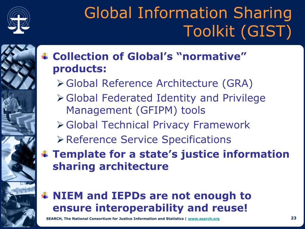 Global Information Sharing Toolkit (GIST) • Collection of Global’s “normative” products: • Global Reference Architecture (GRA) • Global Federated Identity and Privilege Management (GFIPM) tools • Global Technical Privacy Framework • Reference Service Specifications • Template for a state’s justice information sharing architecture • NIEM and IEPDs are not enough to ensure interoperability and reuse!