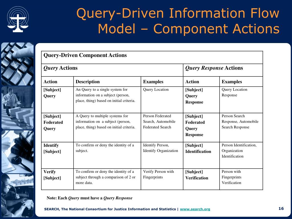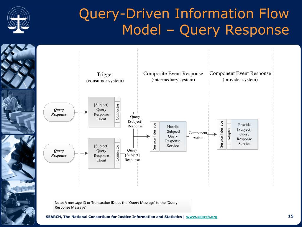 Query-Driven • Query-Driven Archetype • Information flow begins with a practitioner’s or citizen’s desire to know information about the state or history of the justice system (including events that occurred and any responses to those events). • The composite response under this archetype represents the enterprise effort to gather the requested information from one or more component data sources and assemble the component responses into a single, enterprise response to the requestor.