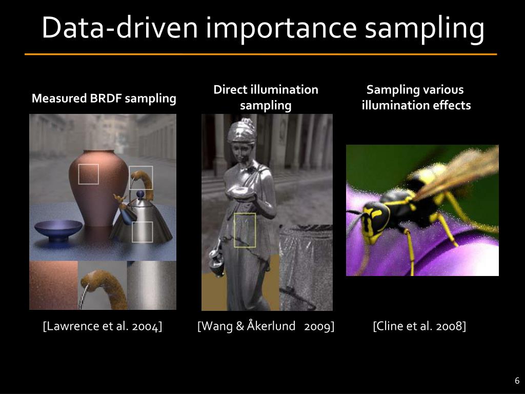 Data-driven importance sampling Direct illuminationsampling Sampling various illumination effects Measured BRDF sampling [Lawrence et al. 2004] [Wang & Åkerlund 2009] [Cline et al. 2008]