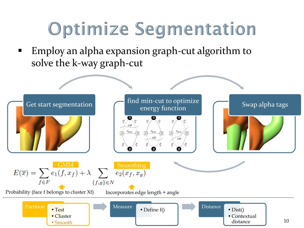 Optimize Segmentation • Partition • Measure • Distance • Test • Cluster • Smooth • Define f() • Dist() • Contextual distance • find min-cut to optimize energy function • Employ an alpha expansion graph-cut algorithm to solve the k-way graph-cut • Get start segmentation • Swap alpha tags GMM Smoothing Probability (face f belongs to cluster Xf) Incorporates edge length + angle