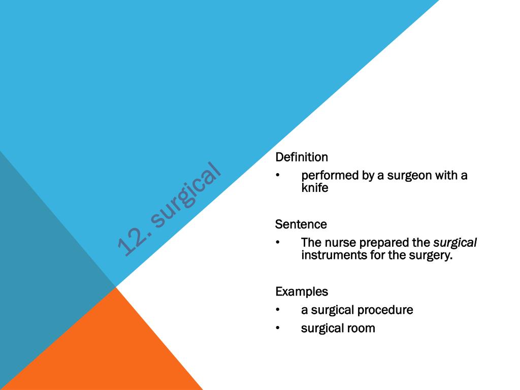 12. surgical • Definition • performed by a surgeon with a knife • Sentence • The nurse prepared the surgical instruments for the surgery. • Examples • a surgical procedure • surgical room