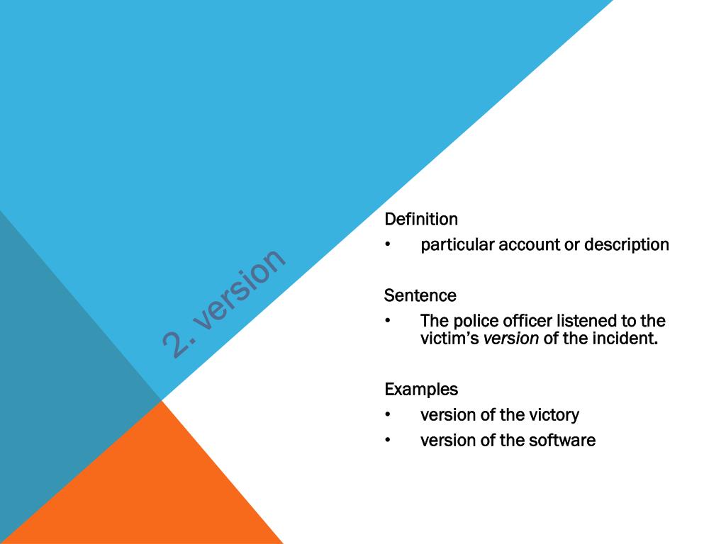 2. version • Definition • particular account or description • Sentence • The police officer listened to the victim’s version of the incident. • Examples • version of the victory • version of the software