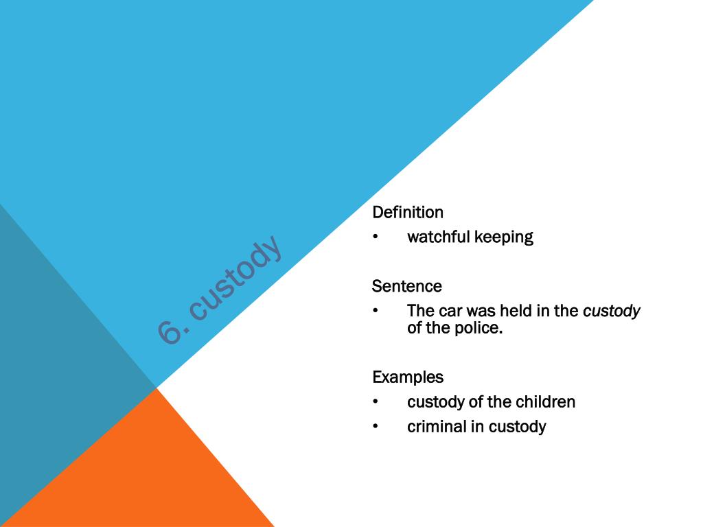 6. custody • Definition • watchful keeping • Sentence • The car was held in the custody of the police. • Examples • custody of the children • criminal in custody
