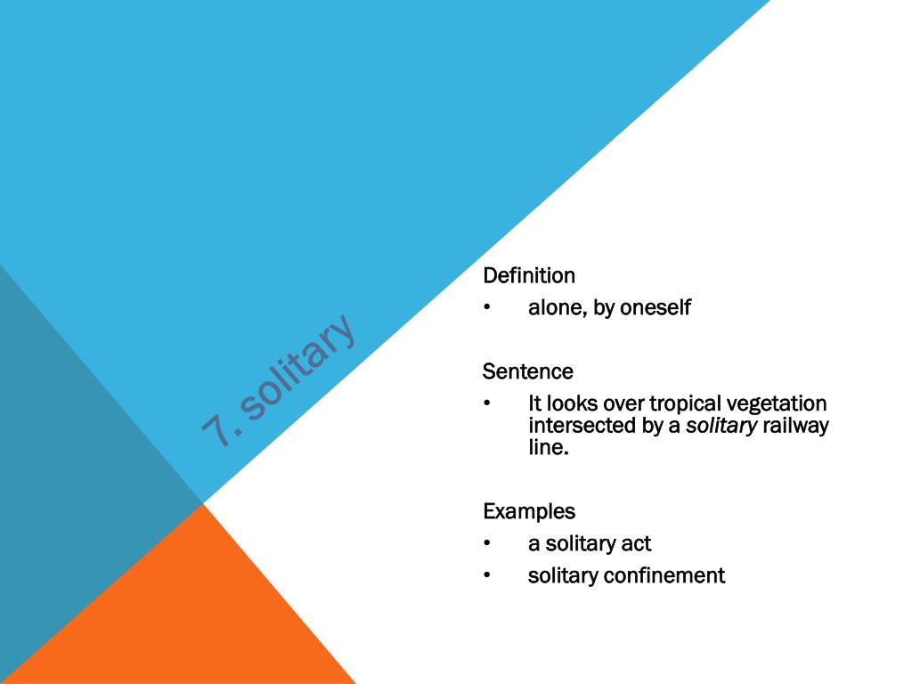 7. solitary • Definition • alone, by oneself • Sentence • It looks over tropical vegetation intersected by a solitary railway line. • Examples • a solitary act • solitary confinement