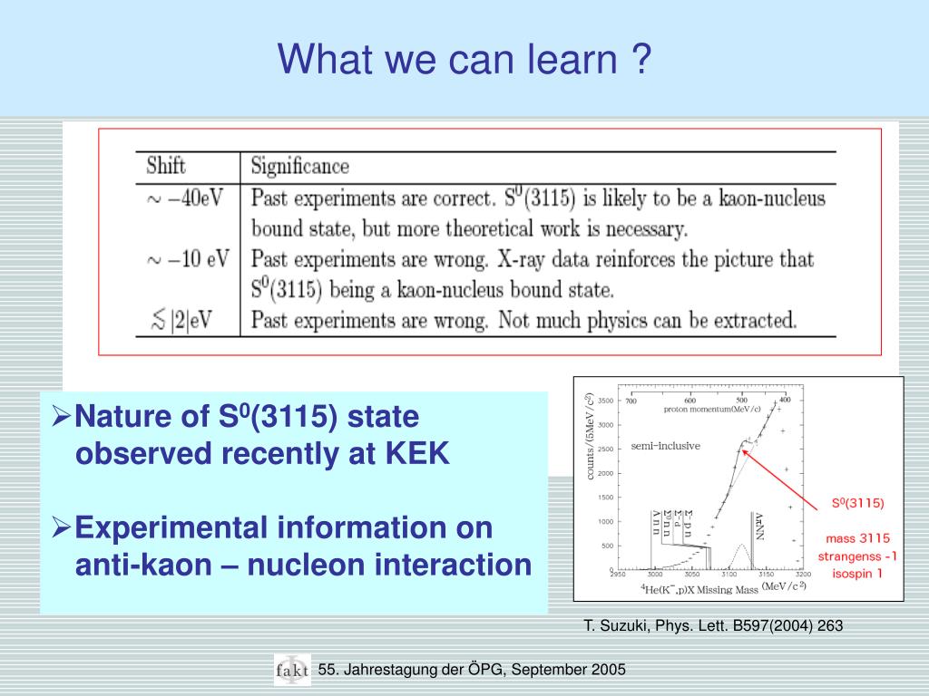What we can learn ? • Nature of S0(3115) state observed recently at KEK • Experimental information on anti-kaon – nucleon interaction T. Suzuki, Phys. Lett. B597(2004) 263 55. Jahrestagung der ÖPG, September 2005