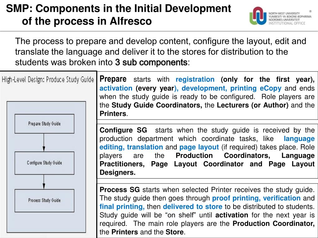 SMP: Components in the Initial Development of the process in Alfresco The process to prepare and develop content, configure the layout, edit and translate the language and deliver it to the stores for distribution to the students was broken into 3 sub components: Prepare starts with registration (only for the first year), activation (every year), development, printing eCopyand ends when the study guide is ready to be configured. Role players are the Study Guide Coordinators, the Lecturers (or Author) and the Printers. Configure SG starts when the study guide is received by the production department which coordinate tasks, like language editing, translation and page layout (if required) takes place. Role players are the Production Coordinators, Language Practitioners, Page Layout Coordinator and Page Layout Designers. Process SG starts when selected Printer receives the study guide. The study guide then goes through proof printing, verification and final printing, then delivered to store to be distributed to students. Study guide will be “on shelf” until activation for the next year is required. The main role players are the Production Coordinator, the Printers and the Store.
