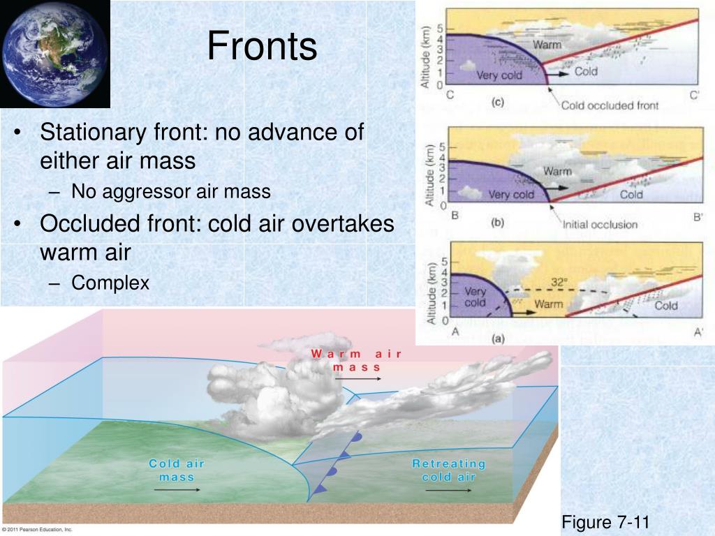 Fronts • Stationary front: no advance of either air mass • No aggressor air mass • Occluded front: cold air overtakes warm air • Complex Figure 7-11