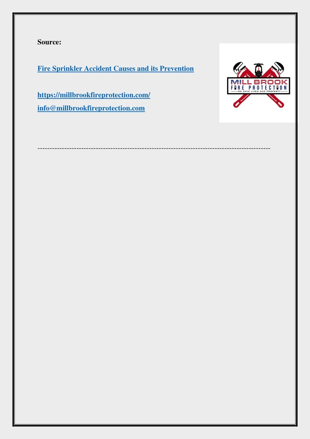 Source: Fire Sprinkler Accident Causes and its Prevention https://millbrookfireprotection.com/ info@millbrookfireprotection.com ------------------------------------------------------------------------------------------------