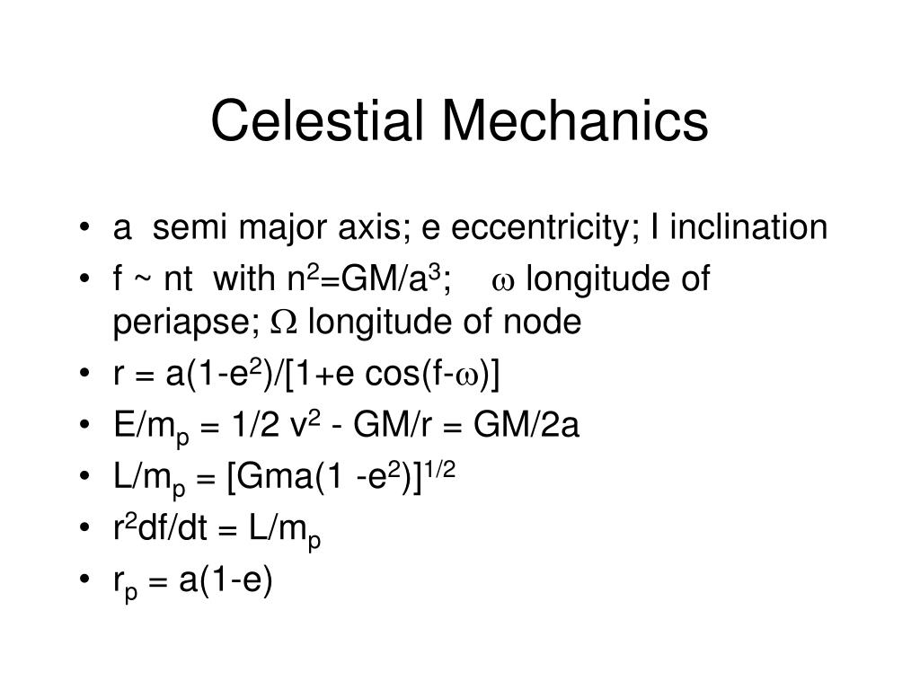Celestial Mechanics • a semi major axis; e eccentricity; I inclination • f ~ nt with n2=GM/a3; longitude of periapse; longitude of node • r = a(1-e2)/[1+e cos(f-)] • E/mp = 1/2 v2 - GM/r = GM/2a • L/mp = [Gma(1 -e2)]1/2 • r2df/dt = L/mp • rp = a(1-e)