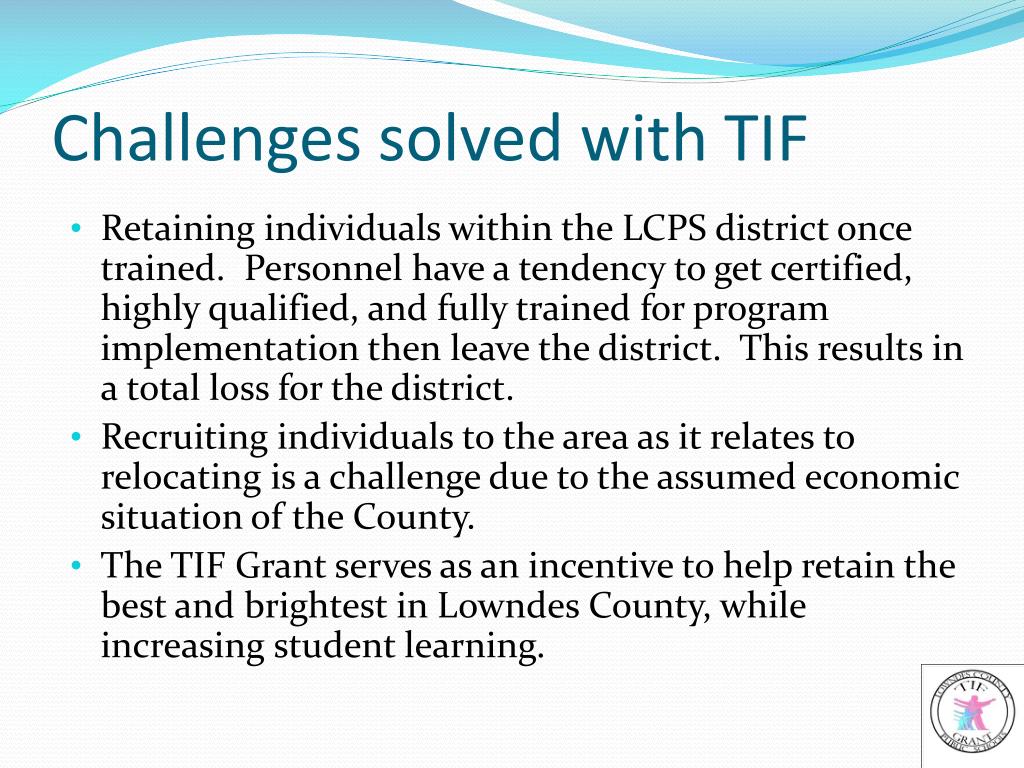 Challenges solved with TIF • Retaining individuals within the LCPS district once trained. Personnel have a tendency to get certified, highly qualified, and fully trained for program implementation then leave the district. This results in a total loss for the district. • Recruiting individuals to the area as it relates to relocating is a challenge due to the assumed economic situation of the County. • The TIF Grant serves as an incentive to help retain the best and brightest in Lowndes County, while increasing student learning.