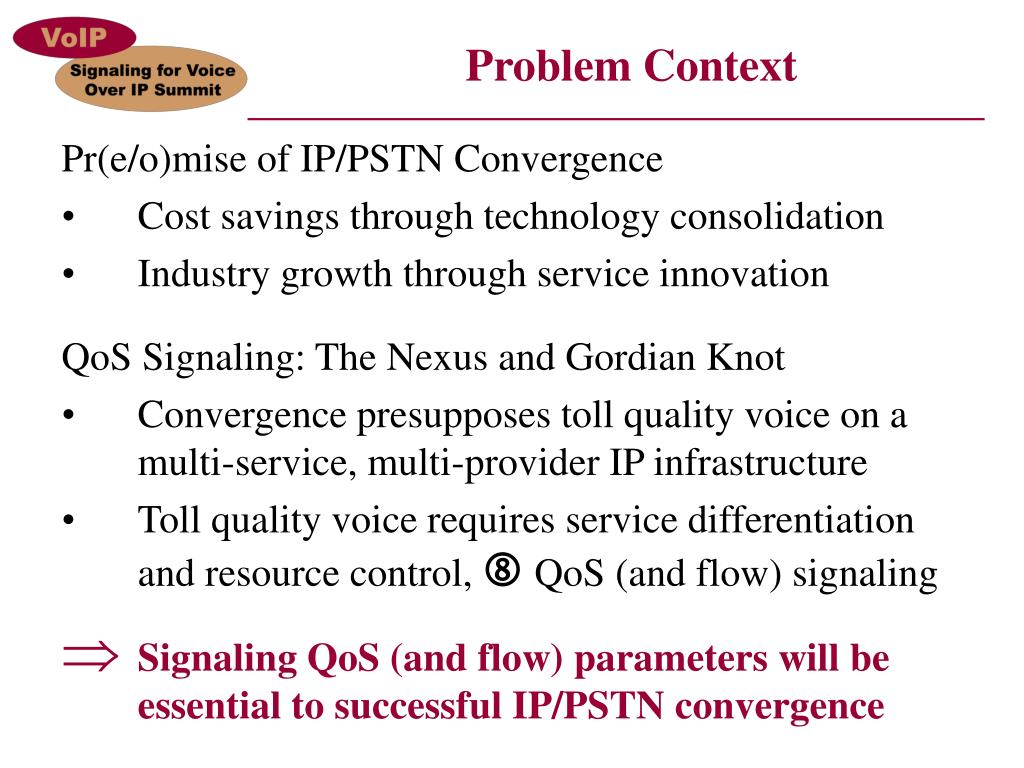 Problem Context Pr(e/o)mise of IP/PSTN Convergence • Cost savings through technology consolidation • Industry growth through service innovation QoS Signaling: The Nexus and Gordian Knot • Convergence presupposes toll quality voice on a multi-service, multi-provider IP infrastructure • Toll quality voice requires service differentiation and resource control, QoS (and flow) signaling • Signaling QoS (and flow) parameters will be essential to successful IP/PSTN convergence