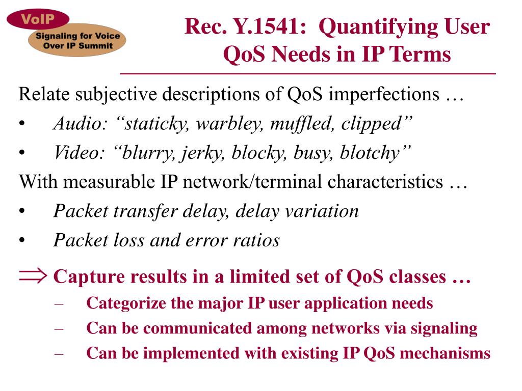Rec. Y.1541: Quantifying User QoS Needs in IP Terms Relate subjective descriptions of QoS imperfections … • Audio: “staticky, warbley, muffled, clipped” • Video: “blurry, jerky, blocky, busy, blotchy” With measurable IP network/terminal characteristics … • Packet transfer delay, delay variation • Packet loss and error ratios • Capture results in a limited set of QoS classes … • Categorize the major IP user application needs • Can be communicated among networks via signaling • Can be implemented with existing IP QoS mechanisms
