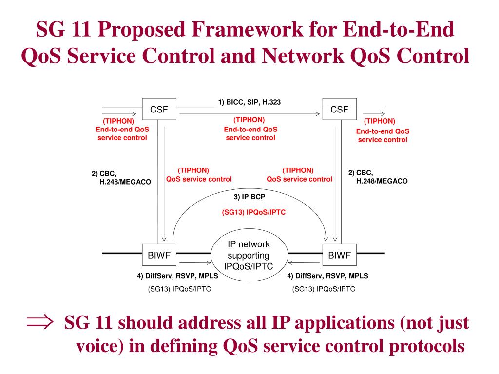 SG 11 Proposed Framework for End-to-End QoS Service Control and Network QoS Control • SG 11 should address all IP applications (not just voice) in defining QoS service control protocols