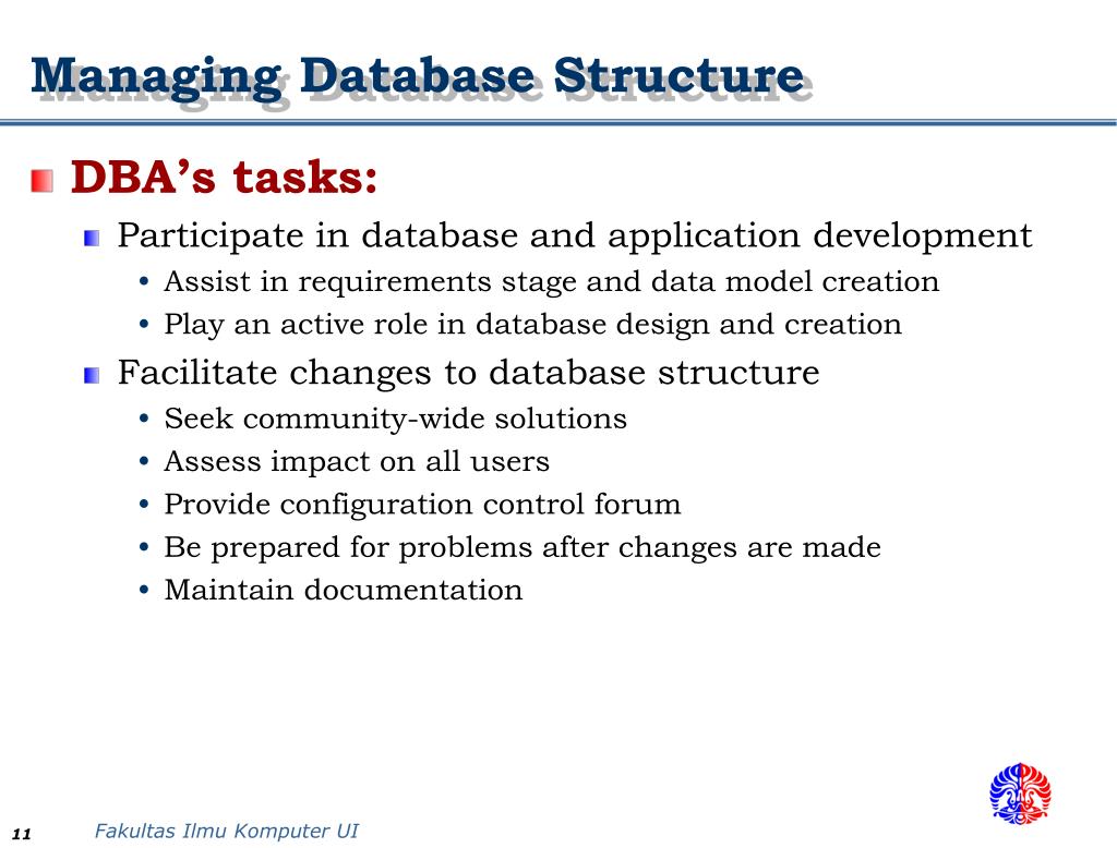 Managing Database Structure • DBA’s tasks: • Participate in database and application development • Assist in requirements stage and data model creation • Play an active role in database design and creation • Facilitate changes to database structure • Seek community-wide solutions • Assess impact on all users • Provide configuration control forum • Be prepared for problems after changes are made • Maintain documentation