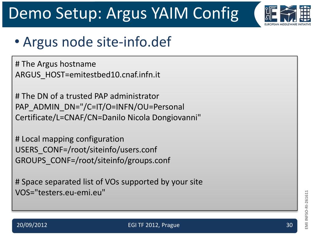Demo Setup: Argus YAIM Config • Argus node site-info.def # The Argus hostname ARGUS_HOST=emitestbed10.cnaf.infn.it # The DN of a trusted PAP administrator PAP_ADMIN_DN="/C=IT/O=INFN/OU=Personal Certificate/L=CNAF/CN=Danilo Nicola Dongiovanni" # Local mapping configuration USERS_CONF=/root/siteinfo/users.conf GROUPS_CONF=/root/siteinfo/groups.conf # Space separated list of VOs supported by your site VOS="testers.eu-emi.eu" EGI TF 2012, Prague