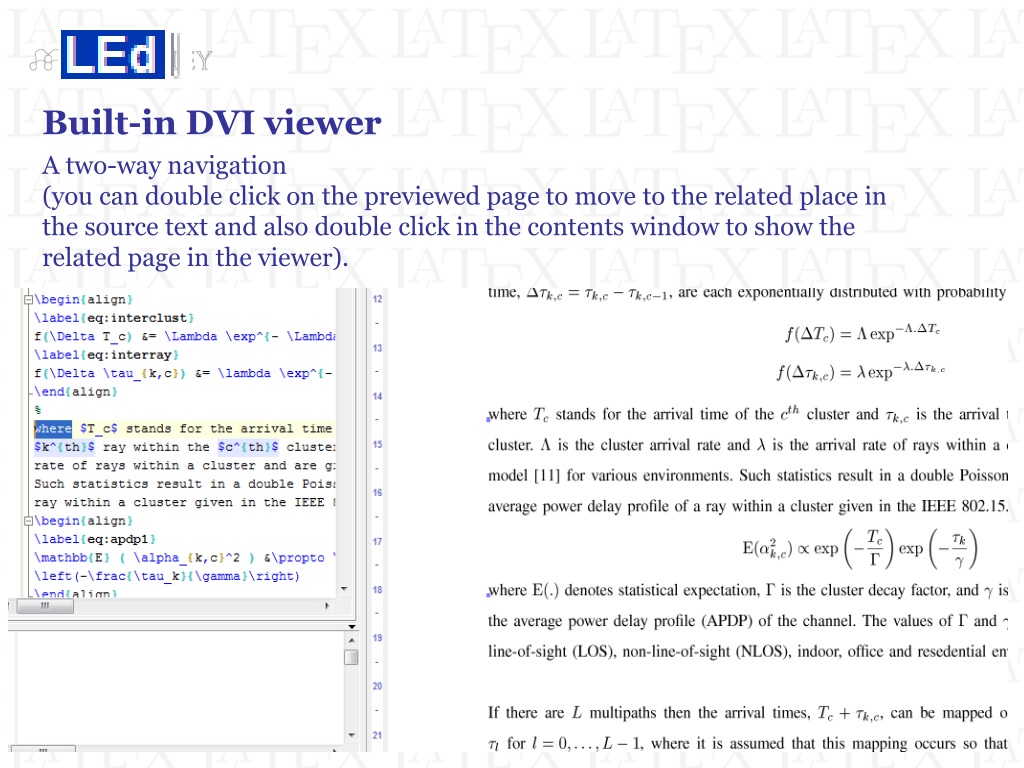 Built-in DVI viewer A two-way navigation (you can double click on the previewed page to move to the related place in the source text and also double click in the contents window to show the related page in the viewer).