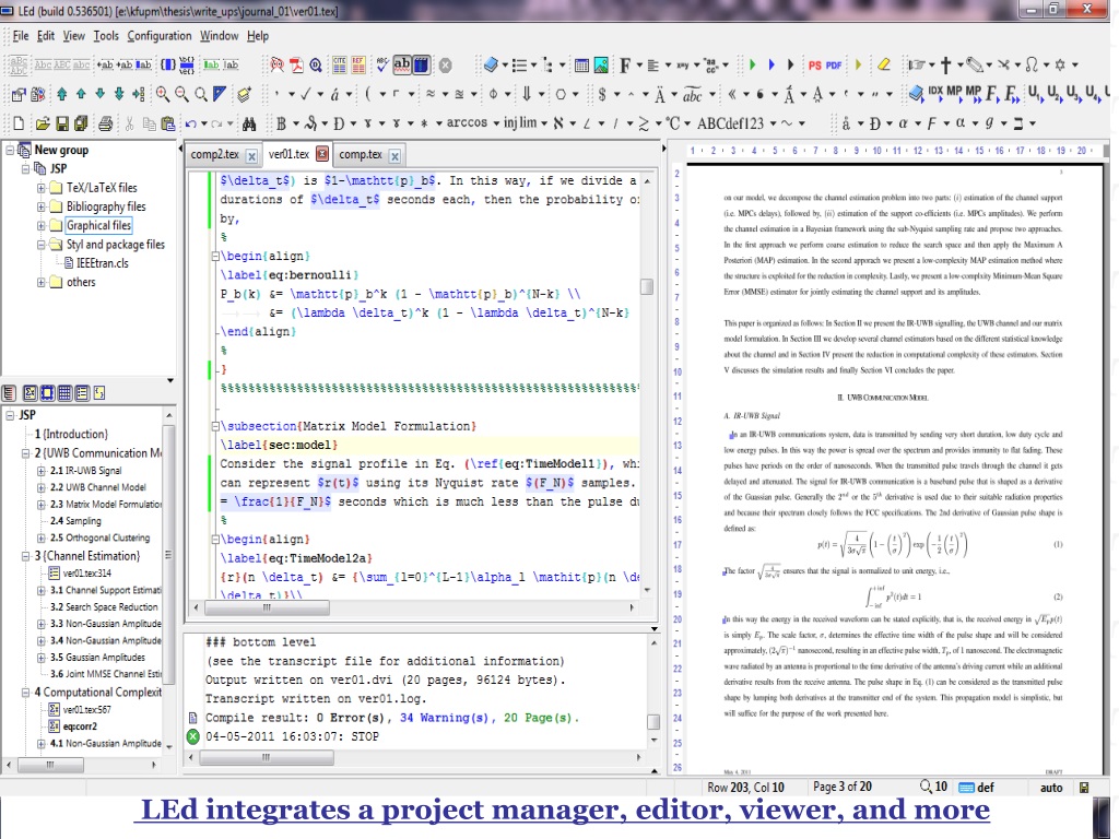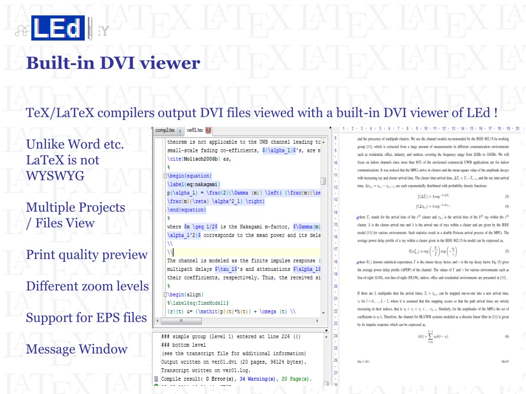 Built-in DVI viewer TeX/LaTeX compilers output DVI files viewed with a built-in DVI viewer of LEd ! Unlike Word etc. LaTeX is not WYSWYG Multiple Projects / Files View Print quality preview Different zoom levels Support for EPS files Message Window