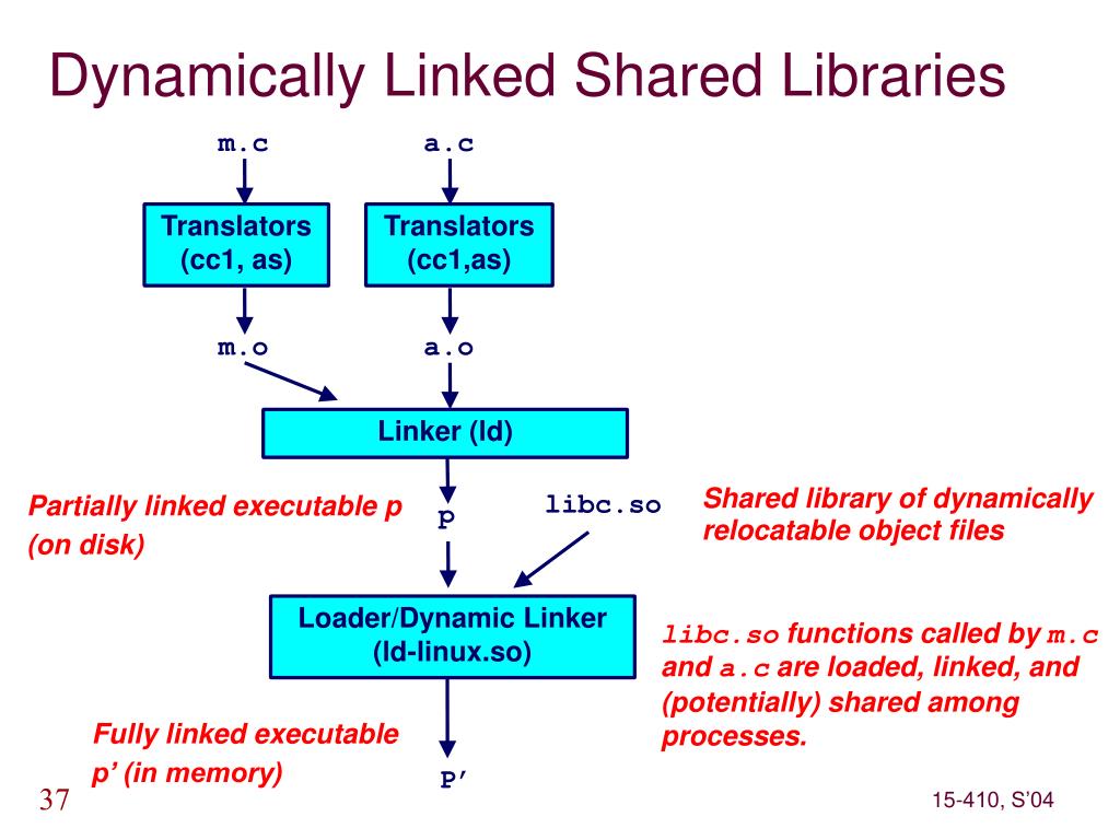 Translators (cc1, as) Translators (cc1,as) Linker (ld) Loader/Dynamic Linker (ld-linux.so) Dynamically Linked Shared Libraries m.c a.c m.o a.o Shared library of dynamically relocatable object files libc.so p Partially linked executable p (on disk) libc.so functions called by m.c and a.c are loaded, linked, and (potentially) shared among processes. Fully linked executable p’ (in memory) P’