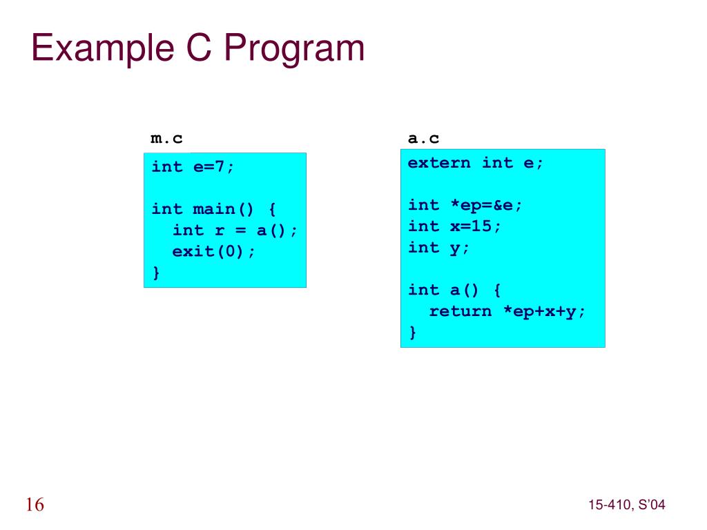 m.c a.c extern int e; int *ep=&e; int x=15; int y; int a() { return *ep+x+y; } int e=7; int main() { int r = a(); exit(0); } Example C Program