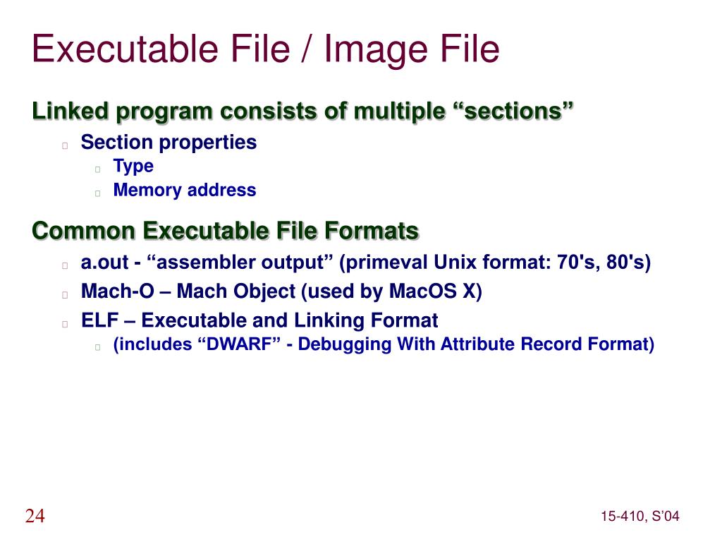 Executable File / Image File • Linked program consists of multiple “sections” • Section properties • Type • Memory address • Common Executable File Formats • a.out - “assembler output” (primeval Unix format: 70's, 80's) • Mach-O – Mach Object (used by MacOS X) • ELF – Executable and Linking Format • (includes “DWARF” - Debugging With Attribute Record Format)