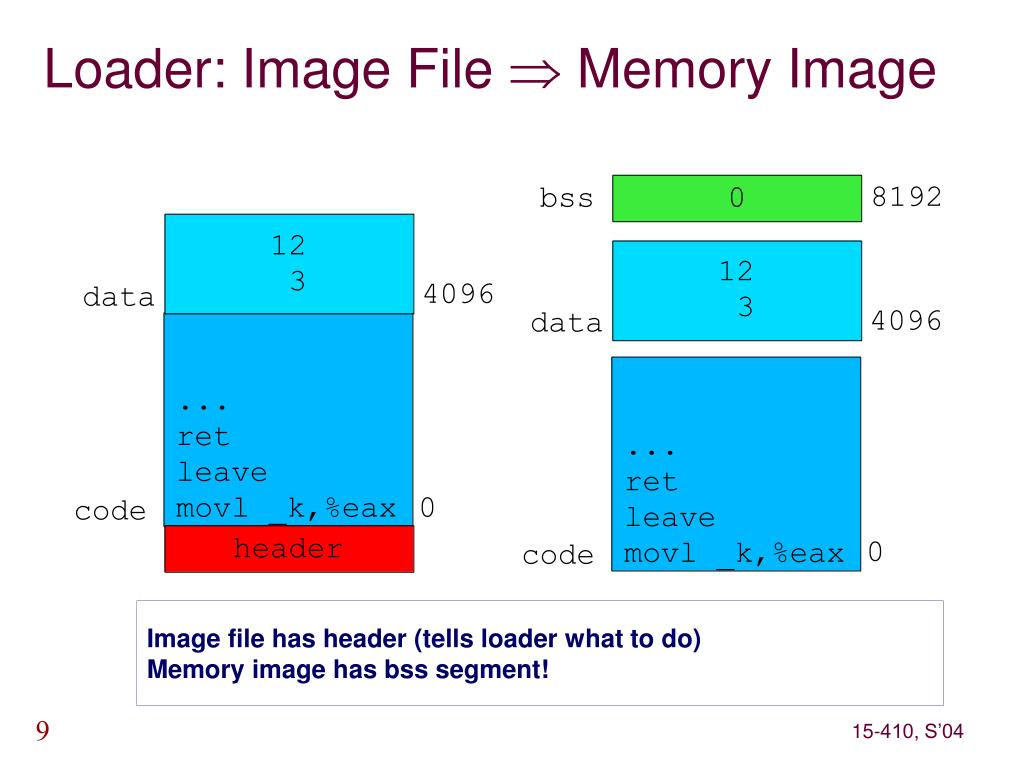 Image file has header (tells loader what to do) Memory image has bss segment! Loader: Image File Memory Image