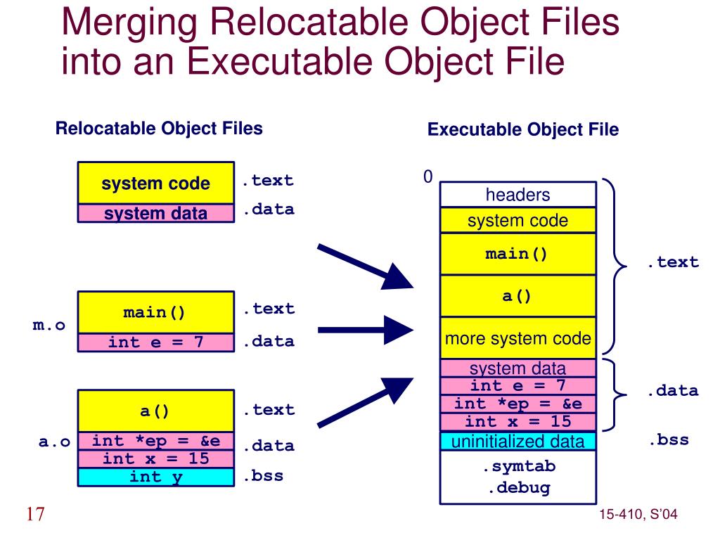 system code headers system data system code main() a() main() more system code int e = 7 system data int e = 7 a() int *ep = &e int x = 15 uninitialized data int *ep = &e int x = 15 .symtab .debug int y Merging Relocatable Object Files into an Executable Object File Relocatable Object Files Executable Object File 0 .text .data .text .text m.o .data .data .text .bss a.o .data .bss