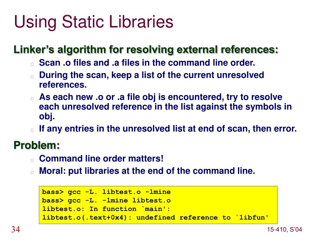 bass> gcc -L. libtest.o -lmine bass> gcc -L. -lmine libtest.o libtest.o: In function `main': libtest.o(.text+0x4): undefined reference to `libfun' Using Static Libraries • Linker’s algorithm for resolving external references: • Scan .o files and .a files in the command line order. • During the scan, keep a list of the current unresolved references. • As each new .o or .a file obj is encountered, try to resolve each unresolved reference in the list against the symbols in obj. • If any entries in the unresolved list at end of scan, then error. • Problem: • Command line order matters! • Moral: put libraries at the end of the command line.
