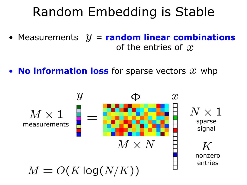 Random Embedding is Stable • Measurements = random linear combinations of the entries of • No information loss for sparse vectors whp sparsesignal measurements nonzero entries