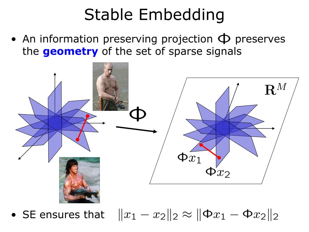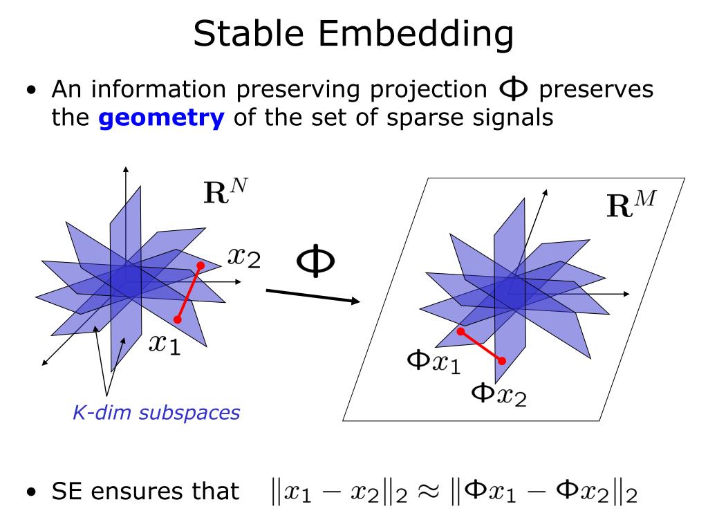 Stable Embedding An information preserving projection preserves the geometry of the set of sparse signals SE ensures that K-dim subspaces