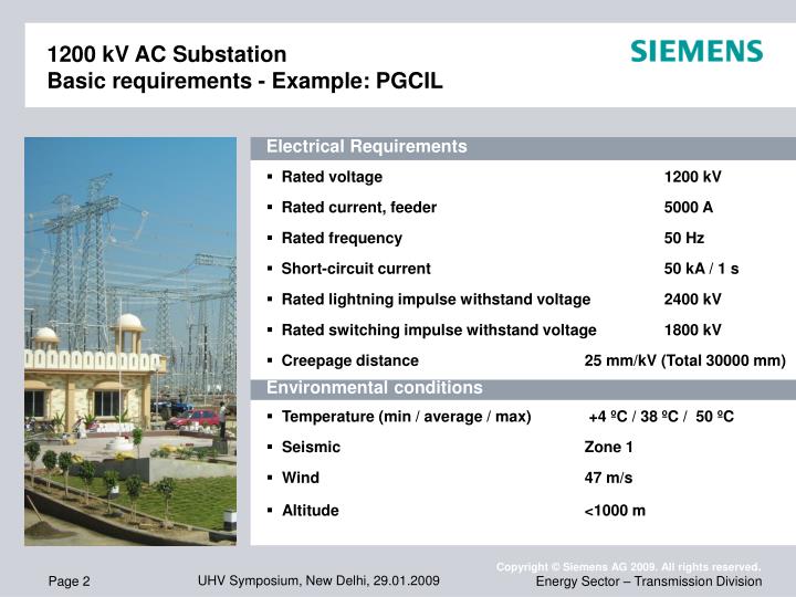 1200 kV AC Substations - Products and Integrated Solutions International UHV Symposium New Delhi, 29. January 2009 Edelhard Kynast Siemens AG, Energy. 1200 kV AC Substation Basic requirements - Example: PGCIL. Electrical Requirements. Rated voltage 1200 kV Rated current, feeder 5000 A
