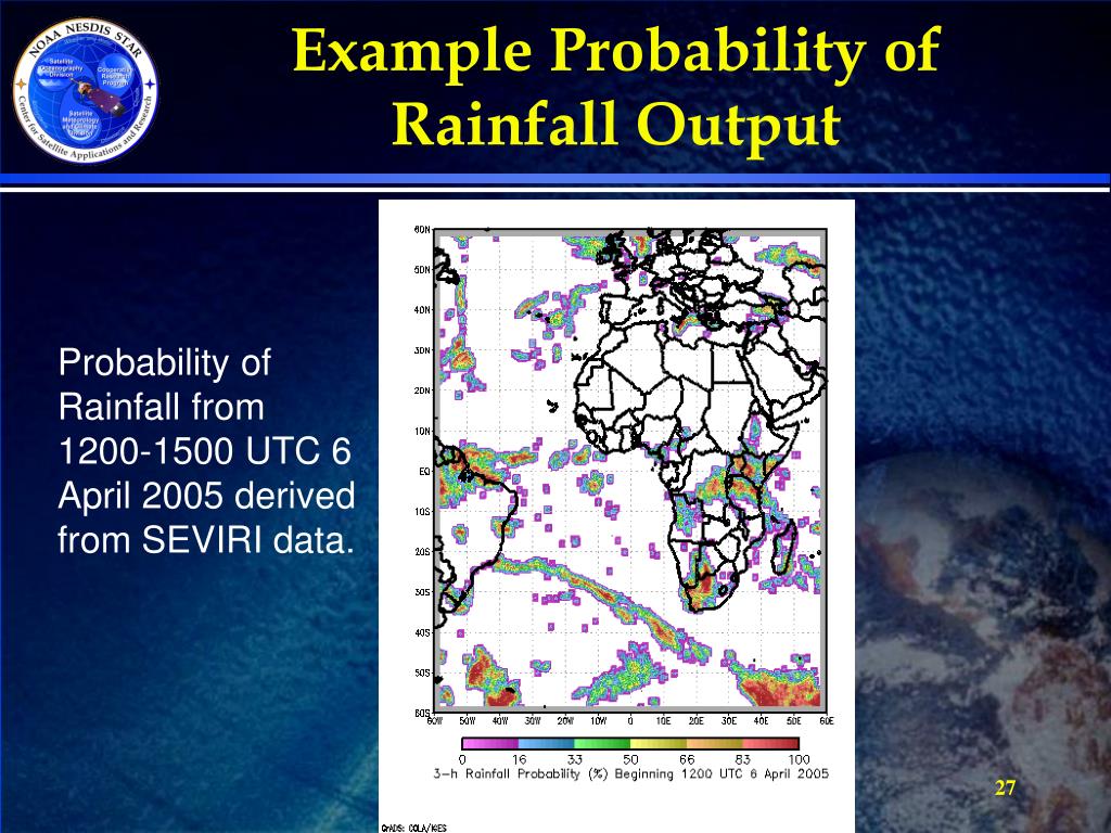 Example Probability of Rainfall Output Probability of Rainfall from 1200-1500 UTC 6 April 2005 derived from SEVIRI data.