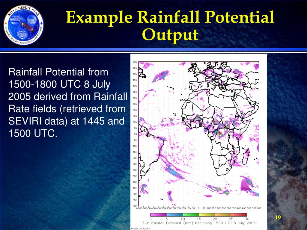 Example Rainfall Potential Output Rainfall Potential from 1500-1800 UTC 8 July 2005 derived from Rainfall Rate fields (retrieved from SEVIRI data) at 1445 and 1500 UTC.