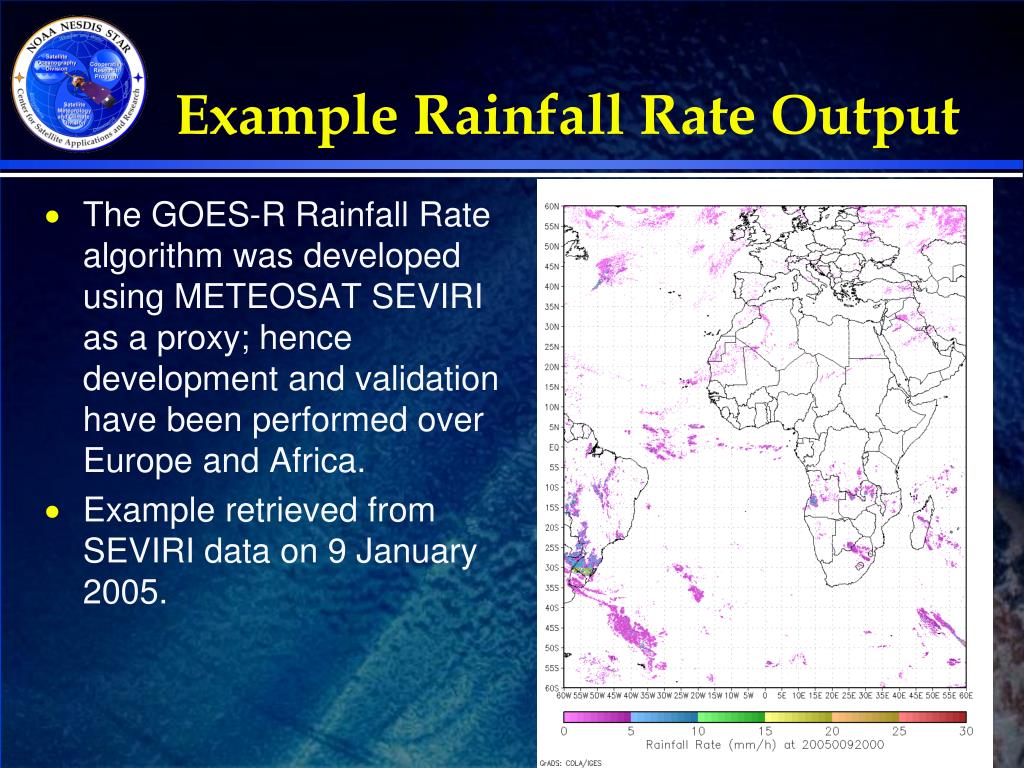 Example Rainfall Rate Output • The GOES-R Rainfall Rate algorithm was developed using METEOSAT SEVIRI as a proxy; hence development and validation have been performed over Europe and Africa. • Example retrieved from SEVIRI data on 9 January 2005.