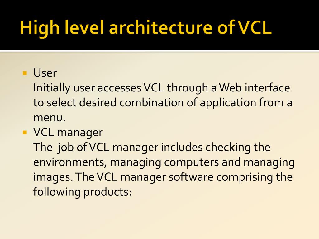 High level architecture of VCL • User Initially user accesses VCL through a Web interface to select desired combination of application from a menu. • VCL manager The job of VCL manager includes checking the environments, managing computers and managing images. The VCL manager software comprising the following products:
