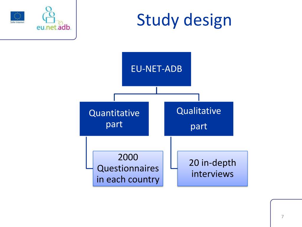 EU-NET-ADB study Project aims: 1 2 3 4 • Evaluate the prevalence and determinants ofInternet addictive • behaviouramong European adolescents. • Assess qualitatively the development of borderlineaddictive Internet use among European adolescents. • Increase awareness among the wider public regarding internetaddictive behaviouramong European adolescents • Enhance the knowledge base required for the development of • strategies relating to Internet addictive behaviour among youth in Europe.