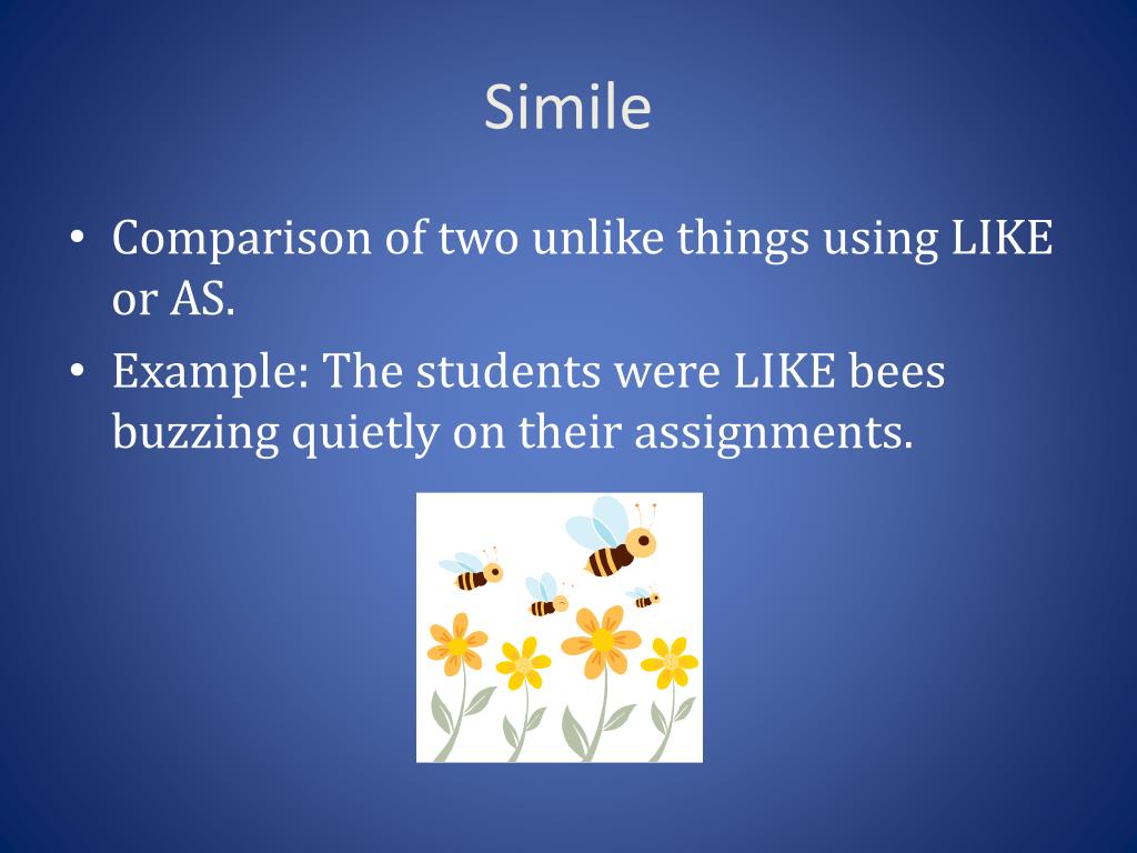 Figurative Language . Simile. Comparison of two unlike things using LIKE or AS. Example: The students were LIKE bees buzzing quietly on their assignments. . Metaphor. Comparison of two unlike things WITHOUT LIKE or AS. Example: The students were bees buzzing quietly o n their assignments.